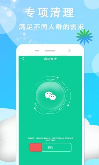 3.功能强大,不仅能清理常见的手机垃圾,还能针对常产生垃圾的软件如微信、QQ等进行专项清理,解决存储不足的问题。