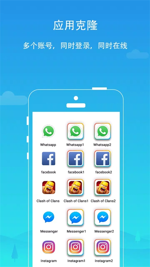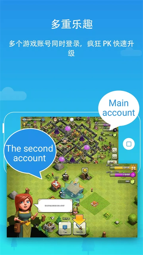 3、免ROOT直接进行软件多开,安卓2.0以上的手机都可以使用,游戏账号多开,大号带小号升级快。
