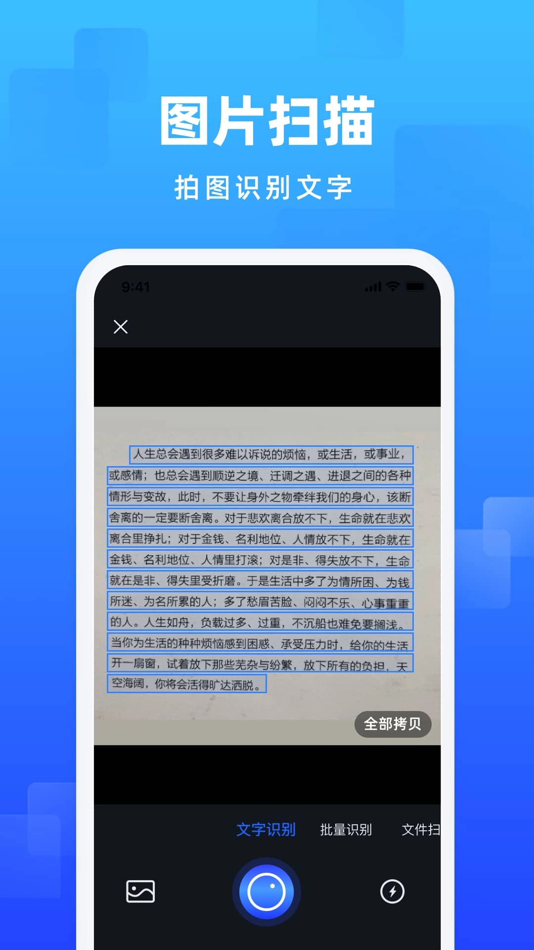 1.不仅支持图片文字识别,还支持扫描件的文字识别,提高了用户的识别效率;
