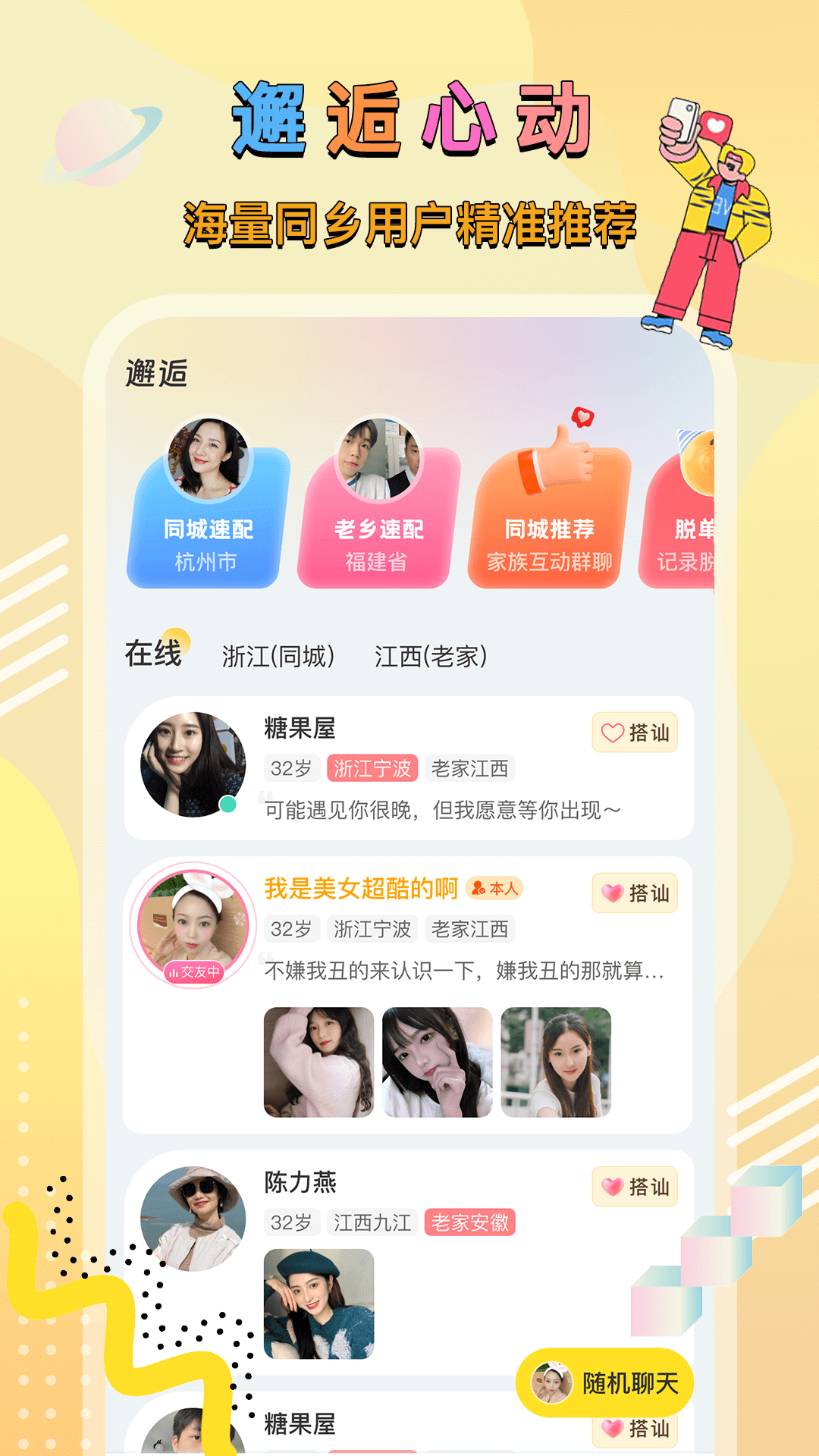 同乡缘上你可以轻松地找到与你同出一门的人,无论你身在何处,只要你在同乡缘上填写了你的家乡信息,系统会智能匹配并为你推荐与你同乡的用户。这样,你就可以与来自同一个地方的人分享彼此的家乡记忆、文化传统、方言等,让你感受到一种独特的归属感。