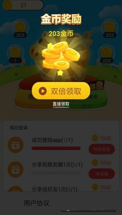 幸福存钱罐app是一款最近非常火热的手机赚钱软件,每天按时登陆都能领取不同数额的金币奖励哦。