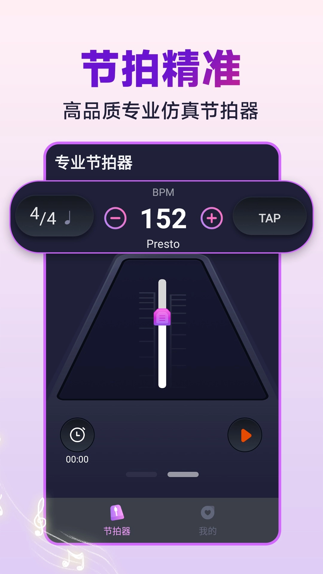 1、节拍精准,高品质的专业仿真节拍器助手,一键操作。