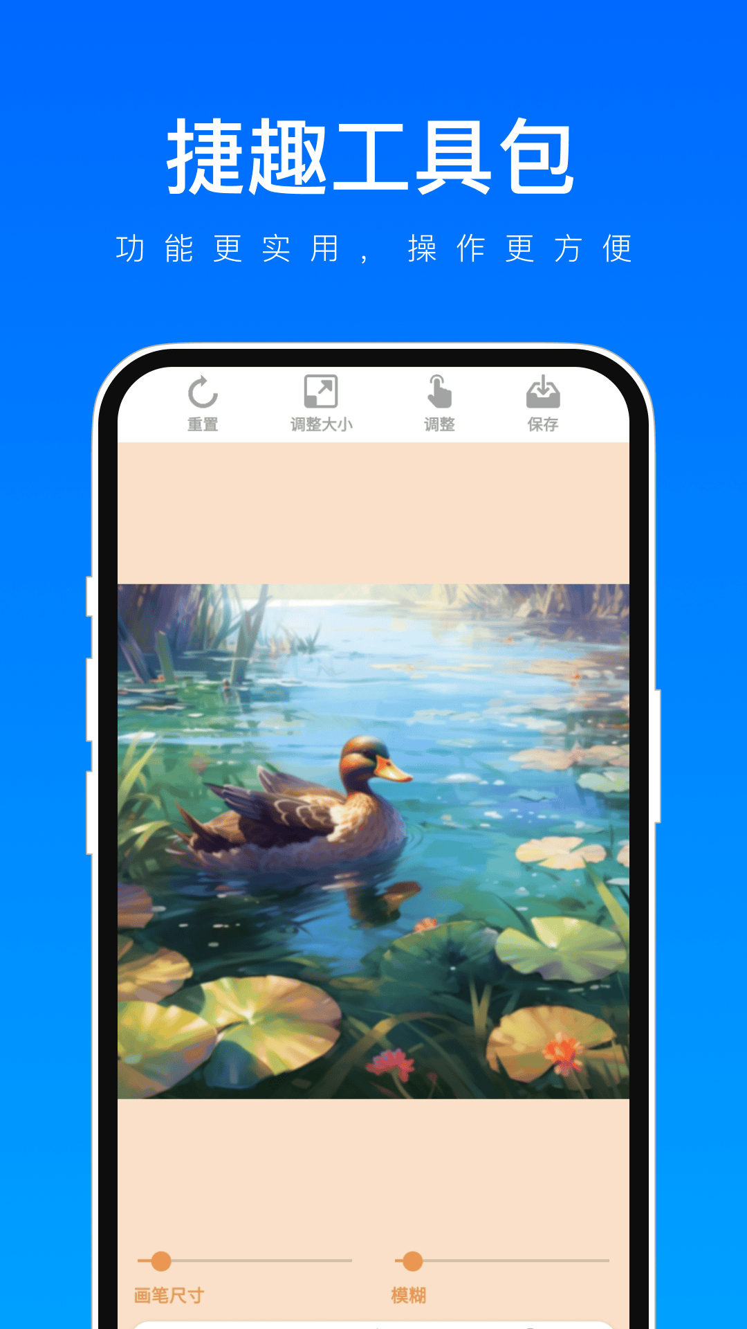 捷趣工具包是一款工具箱助手,该软件提供了丰富的图片编辑功能,用户可以进行照片修图、滤镜处理、贴纸添加等操作,轻松打造个性化的图片作品。捷趣工具包App集成了在线创作工具,用户可以进行海报设计、名片制作、图文排版等,满足用户的各种创意需求。