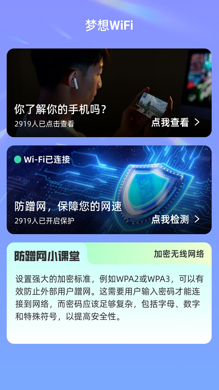 梦想WiFi是一款可以帮助用户更好的管理WIFI的软件,不仅可以帮你实时了解网络速度,还可以查看连接设备,设置防蹭网模式,随时进行安全监控,保证安全的上网环境,此外,梦想WiFi软件中还可以智能对网络进行优化,确保网络稳定,有需要的小伙伴快来下载试试吧!