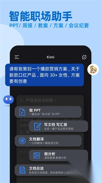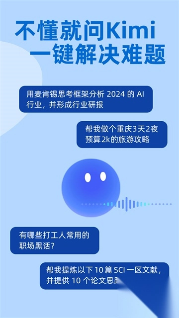 kimi智能助手是一款超级实用的AI工具,功能强大,不仅可以帮助用户对问题进行解答,还可以根据用户需求智能生成内容,帮你轻松提高学习和工作效率,此外,kimi智能助手软件中还有非常专业的资料整理功能,帮你轻松处理各种资料,有需要的小伙伴快来下载体验吧!