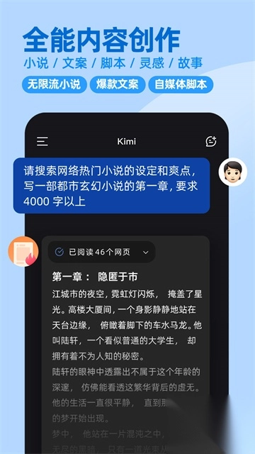 1、不管是文章写作还是资料整理,kimi智能助手软件都可以帮你快速完成,轻松提高效率。