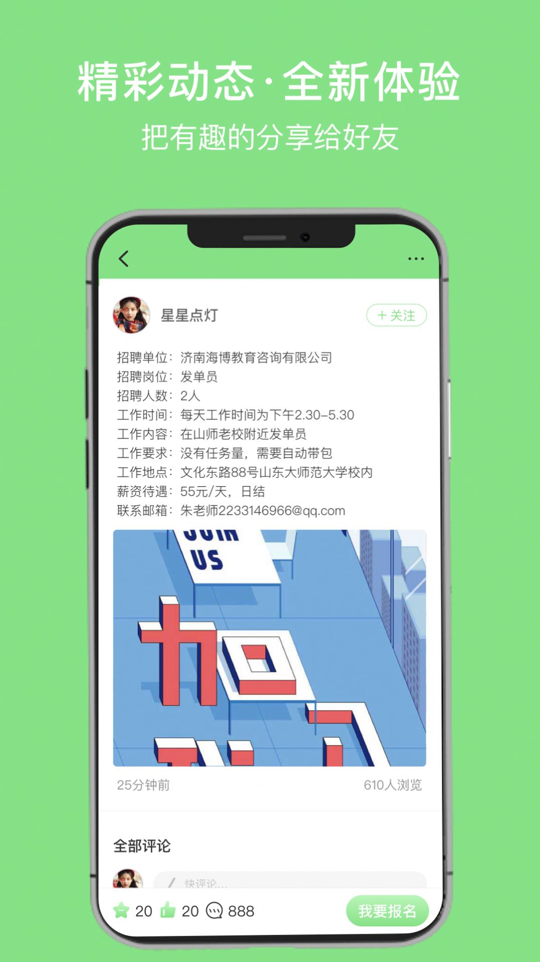 不外出就可以完成相关的操作,而且可以实时分享一些兼职的心情和动态,让朋友了解,互动更加轻松。