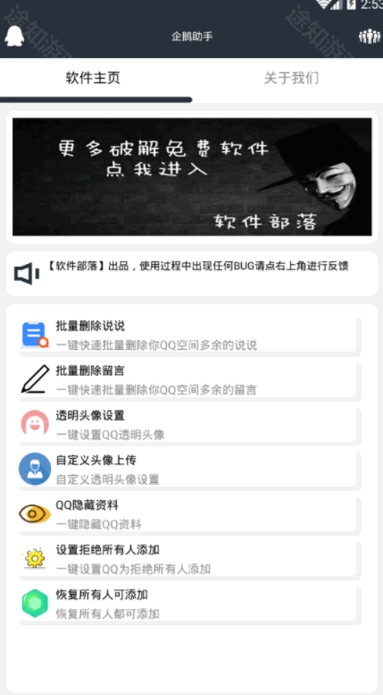 企鹅助手是一款专门为QQ玩家设计的一款实用软件,功能非常多,软件操作简单,一键删说说,设置透明头像、背景,感兴趣的快来吧!企鹅助手是一款专为qq用户推出的手机辅助软件,这款软件操作简单, 想用什么功能,直接进行相关的操作即可,企鵝助手让你感受到前所未有的qq体验,操作简单,让你后可以尽快的上手使用,对企鹅助手有想法的用户们,还在等什么,现在抓紧时间感受一下吧。