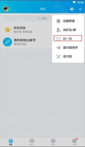 2、打开qq软件,点击+号,然后扫一扫,选择保存的二维码;
