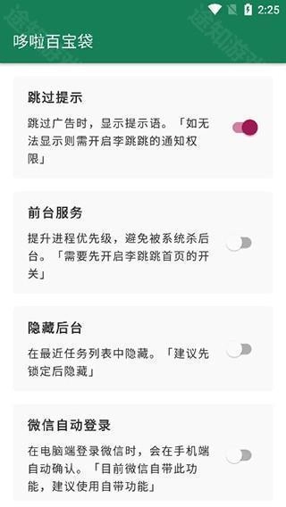 4、在“哆啦百宝箱”里,可以查看软件的详细设置,其中涵盖跳过提示、隐藏后台等。