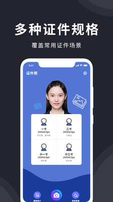 一寸照、二寸照、宝宝证件照、护照照片、签证照片、身份证照片、岗位证件照片、考试证件照片、简历照片、名片照片等数百种证件照尺寸格式。