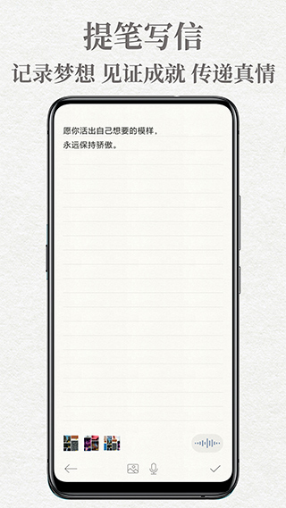 目前,“给未来写封信”支持图片、文字、语音等写信方式。你不但能添加当下具有纪念意义的照片,还能录制下想对未来诉说的话语,接着选择合适的时间定时发送就大功告成啦。1. 书写给自己或他人的信件;