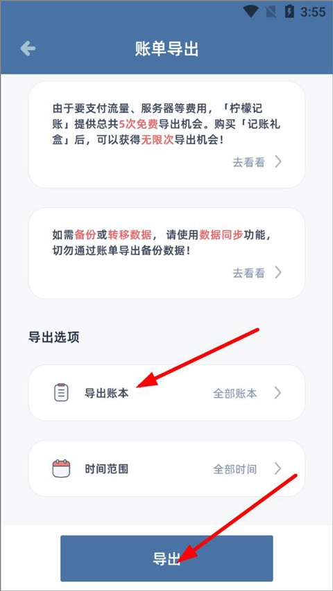 4、打开账单导出页面,导出选项有导出账本、时间范围,点击导出账本,选择默认账本或已添加的账本,选择后点击下方导出即可记录数据。