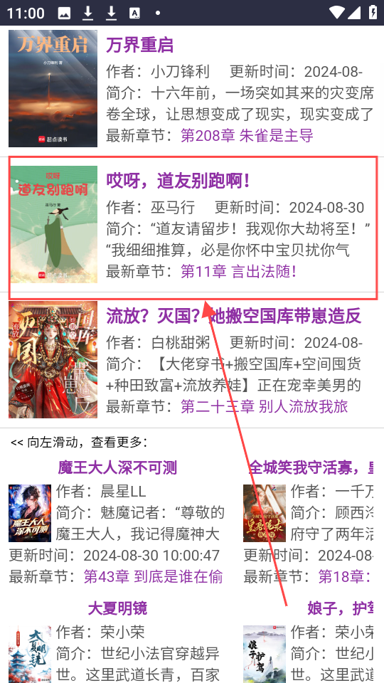 3、在首页查看推荐的小说列表,从中挑选一本自己感兴趣的书籍,然后点击进入。