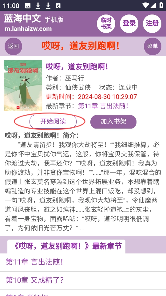 4、比如说“哎呀,道友别跑啊”,选中这本书之后,点击“开始阅读”按钮,就能开启阅读之旅啦。