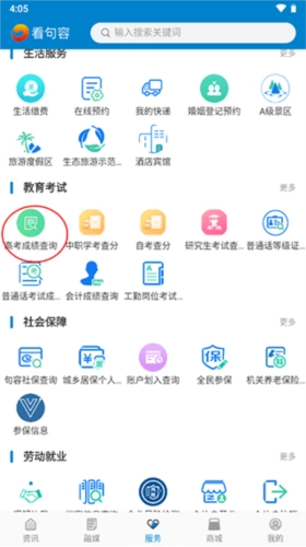 1、若要查询高考成绩,可先打开软件,接着在软件中选择“服务”模块,此模块内包含众多小模块。