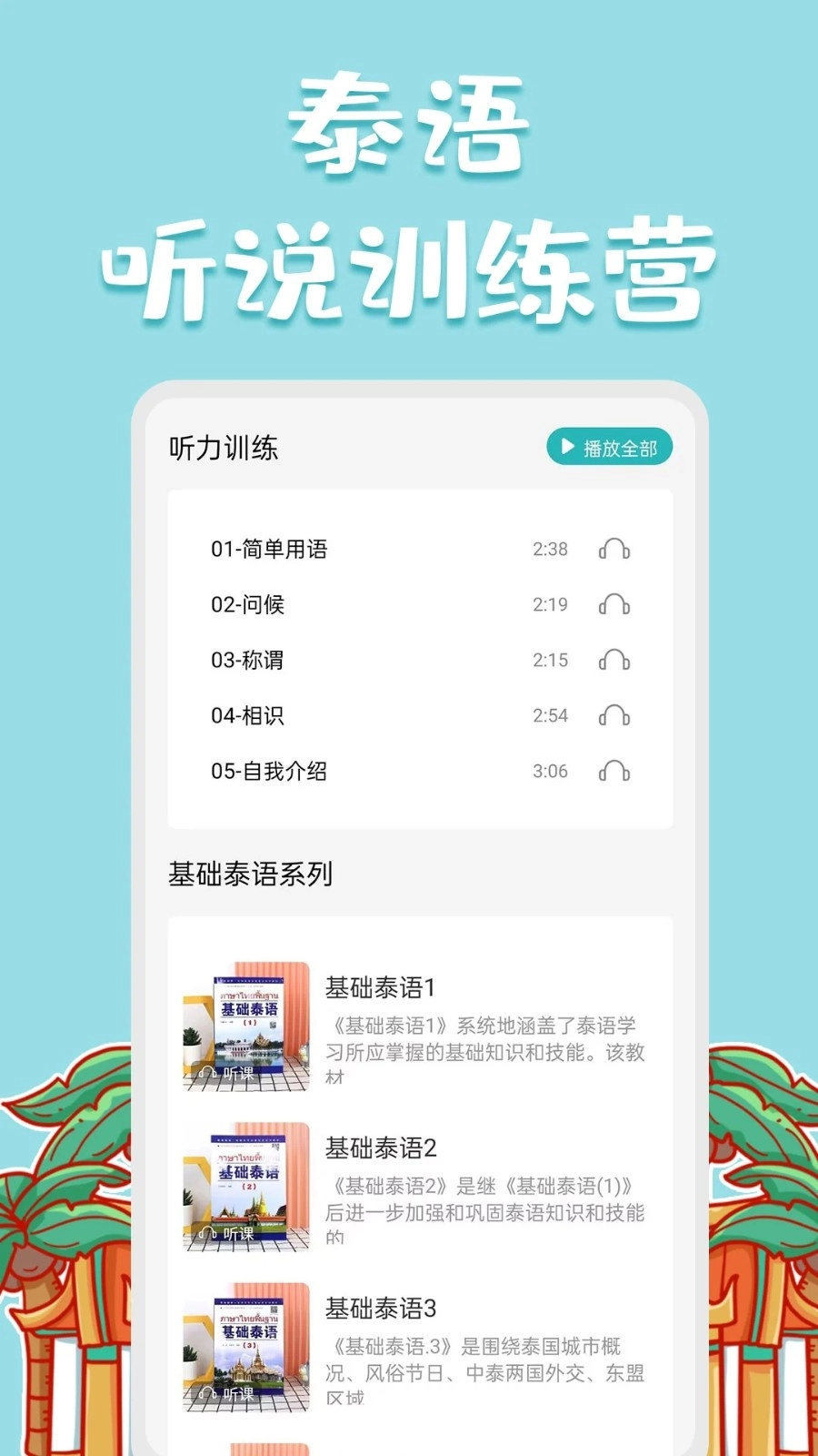 2、听说训练:借助软件,您能够练习泰语的听说能力,循序渐进地学习泰语,使用者也可迅速掌握基础的交流内容。