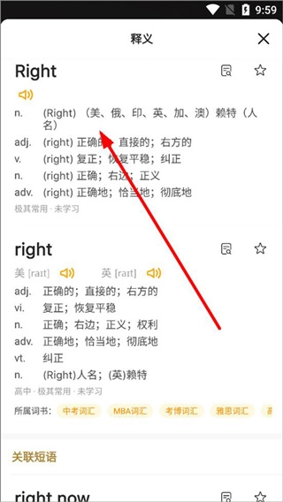 3、进入单词页面,用户能够学习单词的释义、发音以及关联短语等内容。
