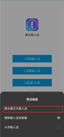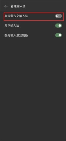 2、接着点击切换输入法,在管理输入法中选择奥云输入法,畅享蒙古文输入之旅。