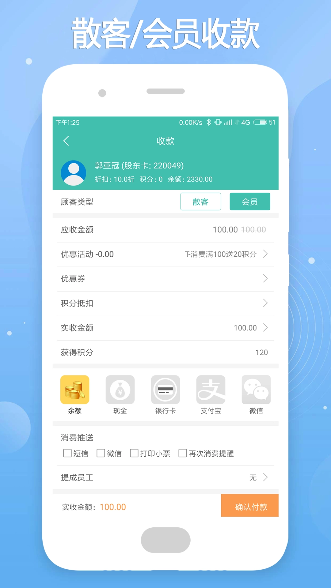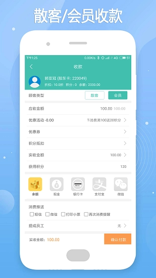 便捷速结:支持多种收款方式,尽享优惠活动与积分折扣,实现快速结账。