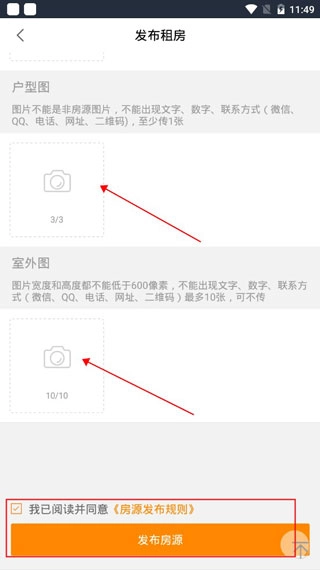 5、然后根据要求,填写房屋的信息,点击相机图标,上传房屋照片,输入完成,点击底部的【发布房源】就可以了