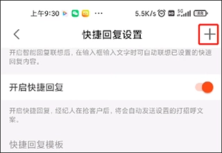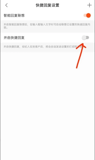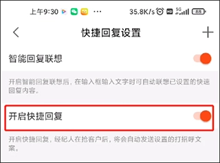 4、然后点击【快捷回复设置】,在这里点击【开启快捷回复】右侧的按钮