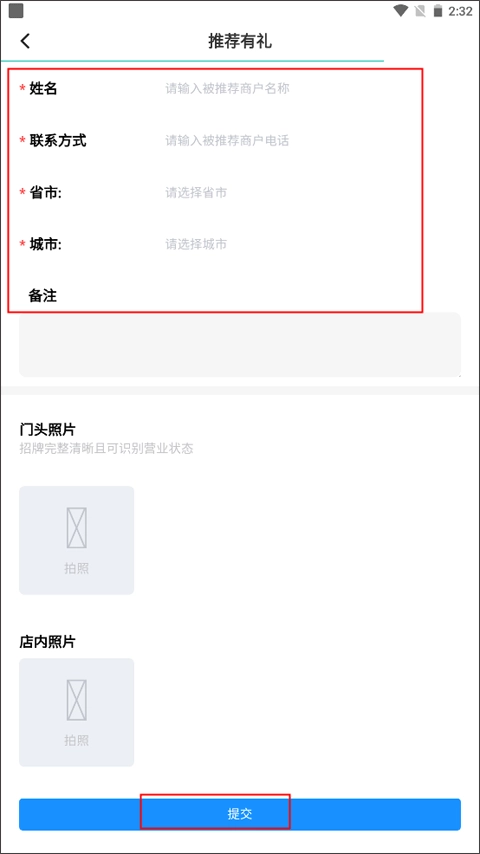 (2)填写自己的姓名、联系方式、所在位置,上传相对应的门头、店内照片,最后点击提交就可以了。