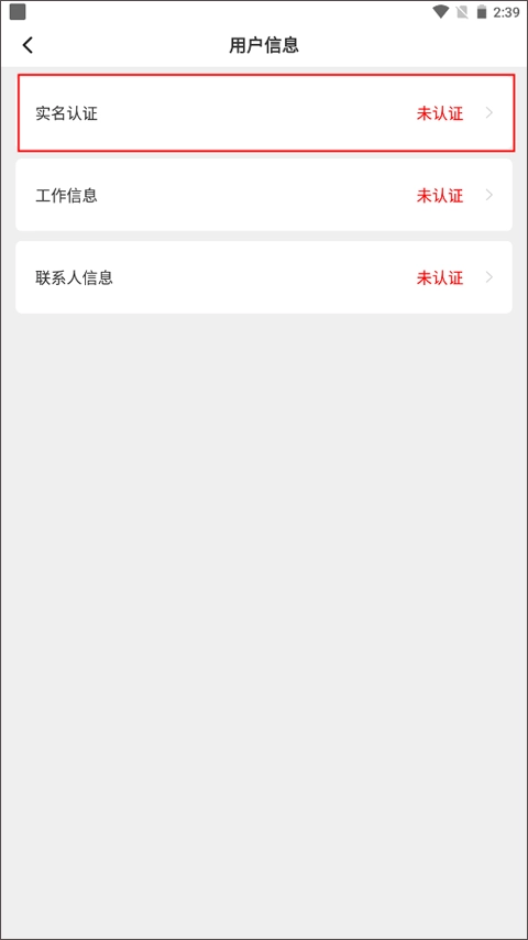 2、用户信息包含实名认证、工作信息、联系人信息这三种认证方式,点击“实名认证”。
