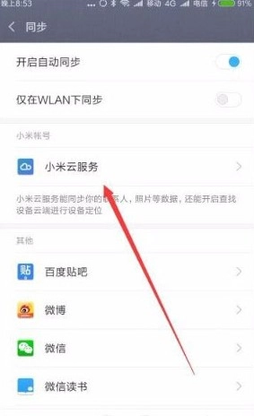 3、这时就会打开同步设置页面,在页面中点击“小米云服务”菜单项;