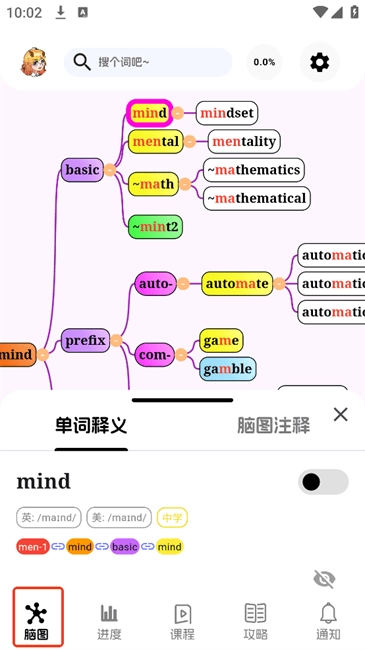 1. 启动麒麟单词App,进入【脑图】板块,便能看到单词分析脑图。借助这一脑图,能够更直观地学习相似单词。
