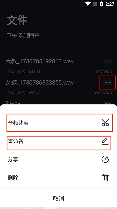 3、在录音库里找到刚刚录制的音频,可以给文件进行重命名,下次更好查找。点击音频裁剪,进行剪裁。