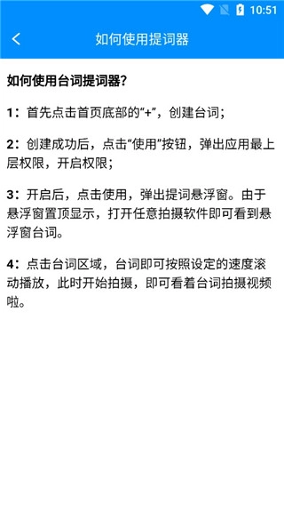 c、开启后,点击使用,弹出提词悬浮窗。由于悬浮窗置顶显示,打开任意拍摄软件即可看到悬浮窗台词;