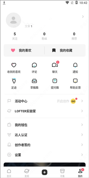 1、打开老福特lofter软件,在界面下方的栏目里,点击黑色的“+”号按钮。