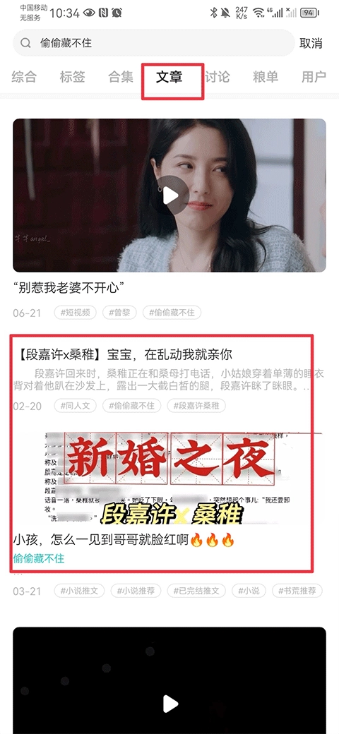 3、当搜索结果呈现后,把页面切换至文章页面,接着在文章页面里找寻你想要阅读的文章就行。