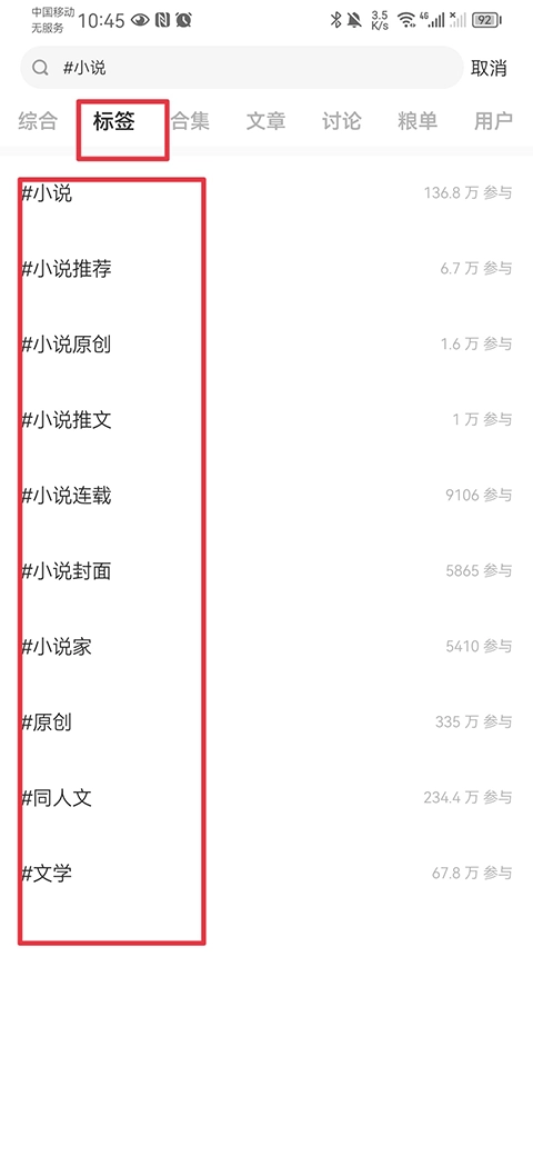 2、于标签页面里挑选你感兴趣的小说标签,像文学、武侠、言情之类。