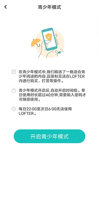 若单日使用时长超出40分钟,需输入密码方可继续使用。另外,每日22:00至次日6:00期间,LOFTER无法使用。