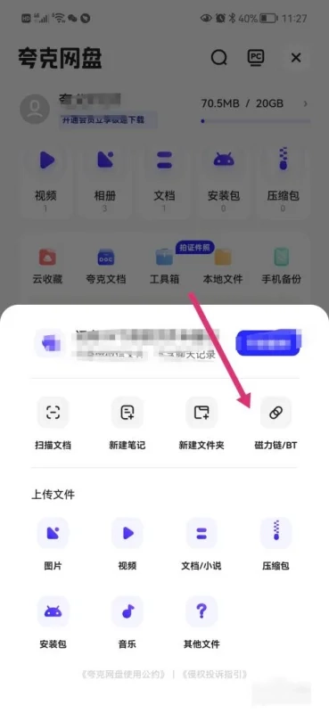 成功登录网盘后,轻点右下角的加号,寻找到带有回形针标志且标注为磁力链/BT的按钮,随后点击该按钮进入。