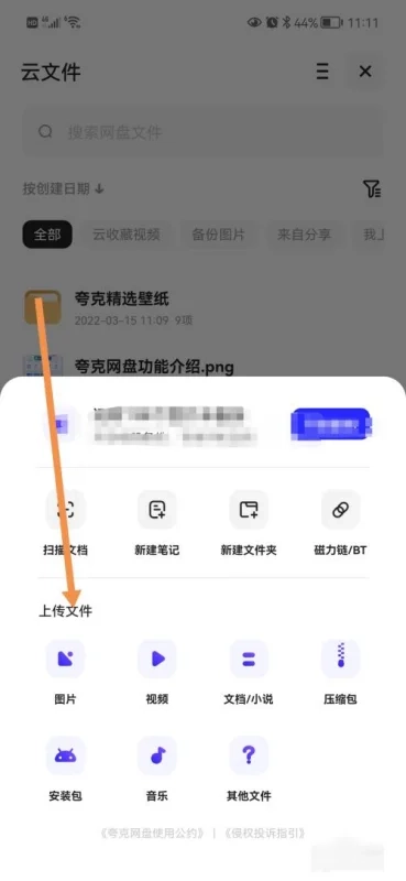 只需轻点右下角的加号,从中挑选你想要保存的文件类型,接着按照所选类型上传文件,如此就能把文件成功保存至个人网盘。