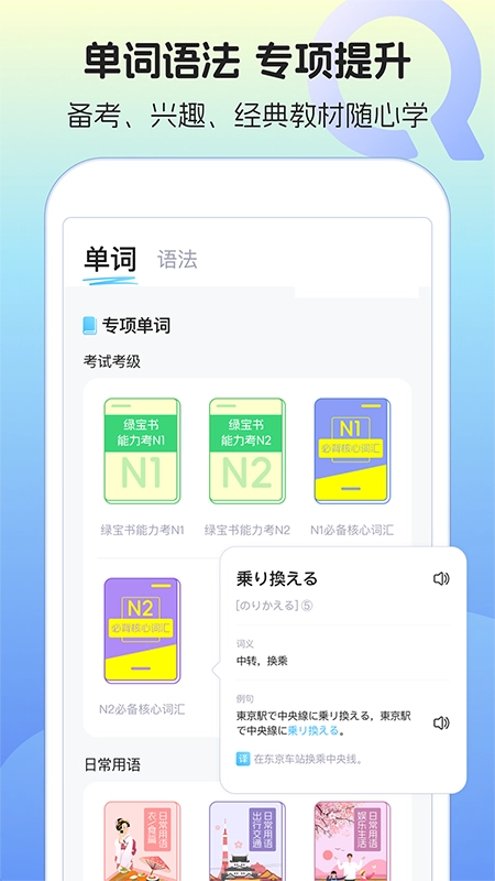 日语单词语法学习,是一款专门为日语爱好者精心打造的日语学习软件。这里拥有海量的词库资源,任你便捷挑选。从单词、释义、解析,到语法、场景例句等内容,全都一站式提供。不仅如此,软件还具备中日翻译功能,能让你随时在线进行双语检索,助力大家更高效、轻松地学习日语。别犹豫啦,快来体验吧!