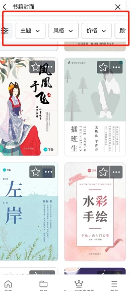 2、点击【查看更多】,就能看到超多的书籍封面的模板了,上面还可以筛选模板的主题、风格等等,当然这里面的模板一部分是免费的,还有一部分是需要收费才能使用的哦,如图所示: