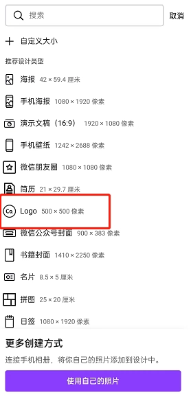 1. 启动Canva可画,点击【+】,接着挑选用于制作logo的画布尺寸。