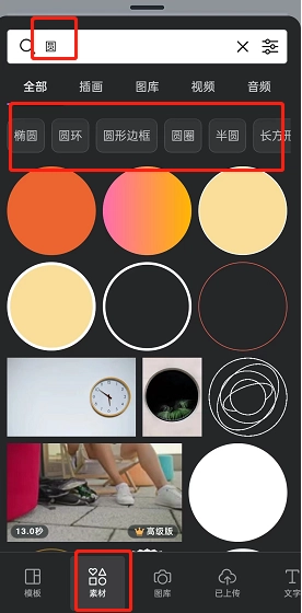 5、除圆形外,若需正方形、长方形或其他图形,可在素材中通过搜索关键词自行查找。