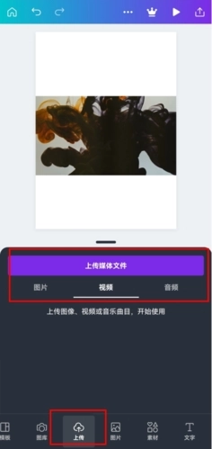 3、如果想要上传自己的视频,可以找到上传里面的视频一览,上传媒体文件找到自己的素材,然后点击右上角的形状,保存或者分享即可。