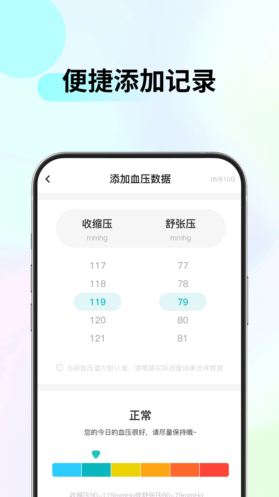 4. 当输入数据之后,系统会自动对血压/血糖状态作出判断,并且以彩色条的形式进行直观呈现。