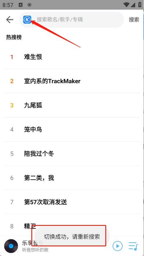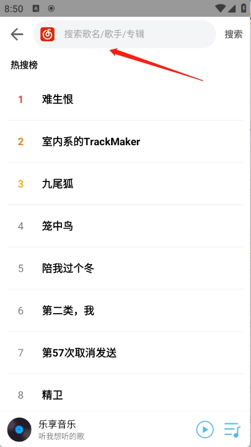 3、点击搜索栏,搜索自己想听的歌就能搜出来了