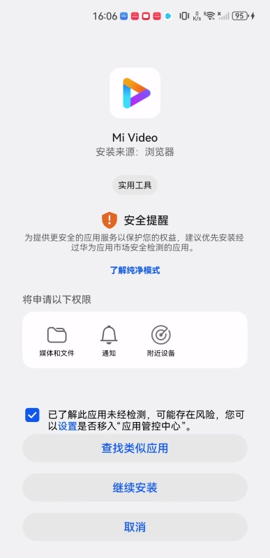 3、接下来第三步,点击勾选“已了解此应用未经检测……”,随后点击“继续安装”。(若出现安全提醒,无需惊慌)