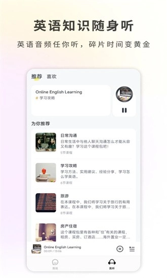 4、拥有丰富的音频资源,能让你充分利用碎片化时间开展英语听力与口语训练,进而提升学习效率。