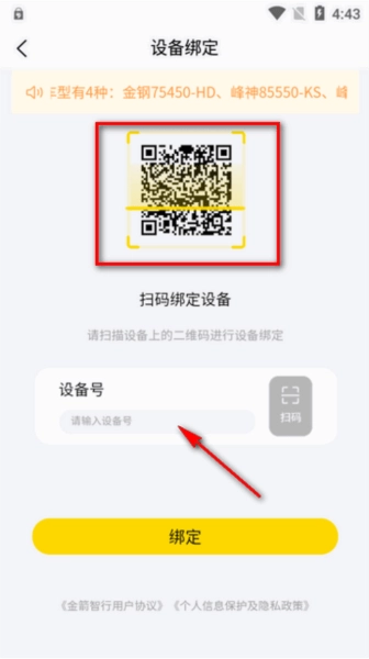 2. 开启软件后,可直接扫描车上的二维码完成绑定,也能直接输入设备号。