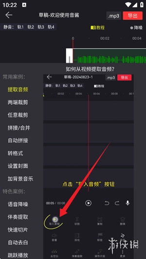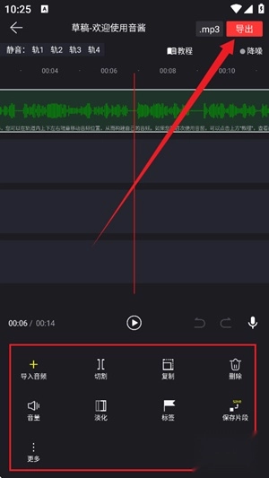 5、于时间轴编辑区域,您能够开展片段分割、内容复制、音量渐变等诸多专业处理。待编辑结束,点击导出按钮以保存作品。