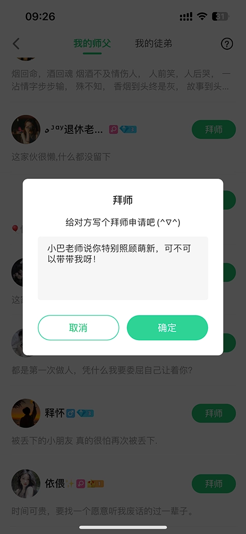 3、这个时候会弹出一个“拜师”的对话框,然后再下面的框框里面写你拜师的申请,点击确定就可以了哦,之后就只需要等待同意即可了。